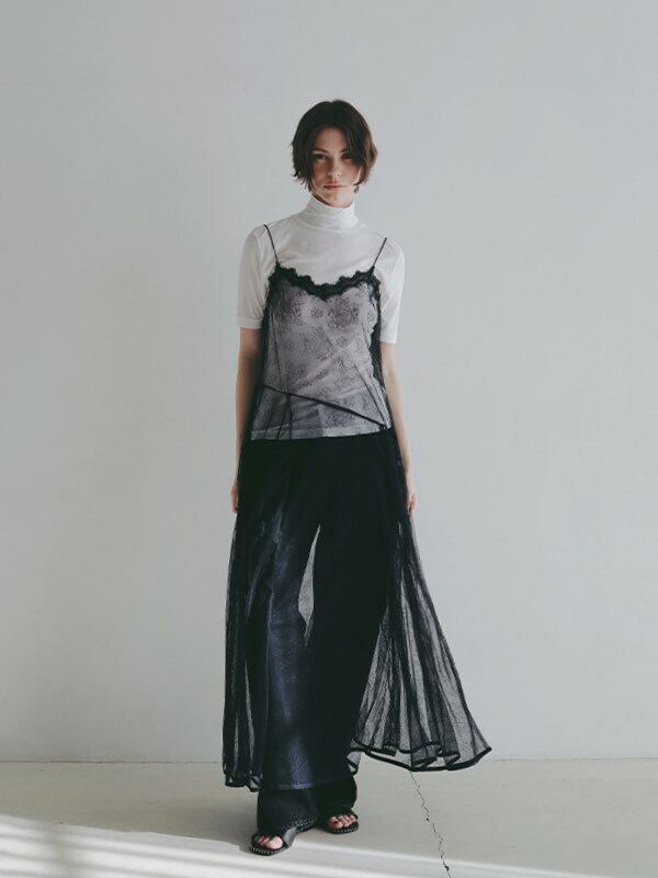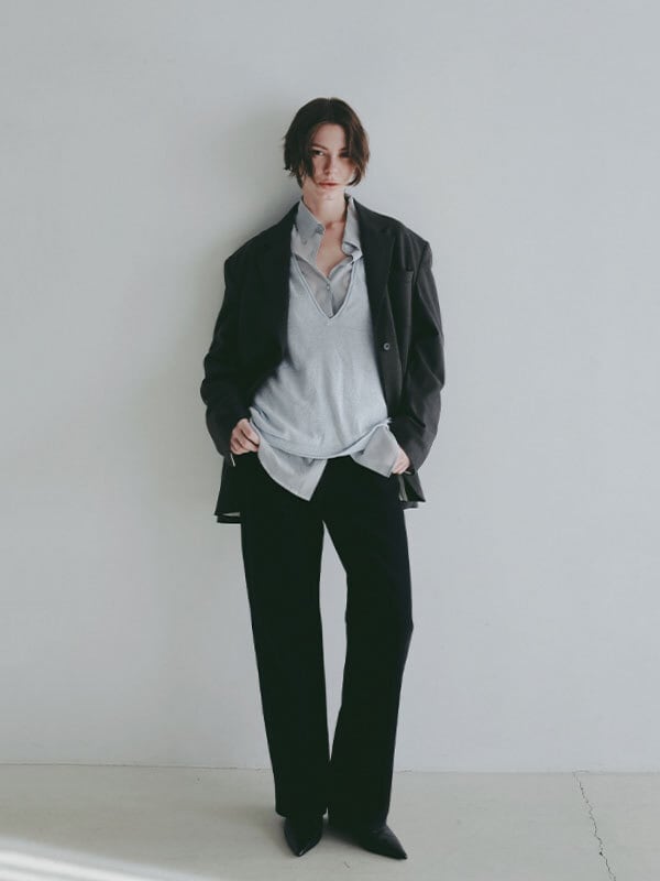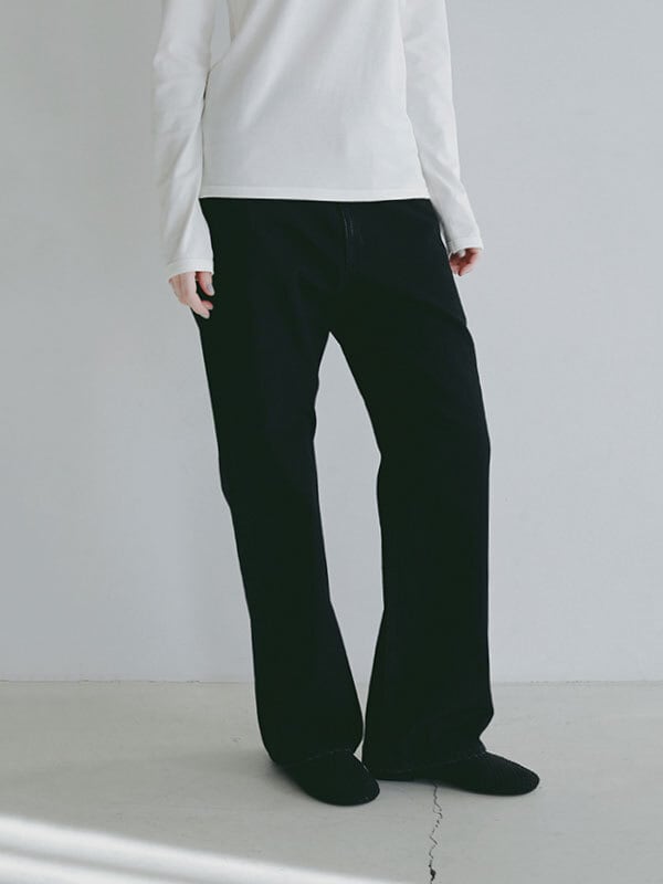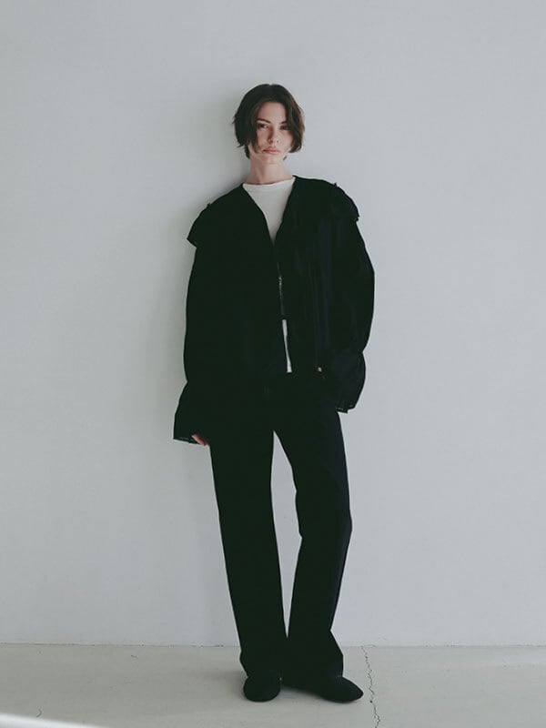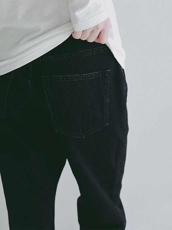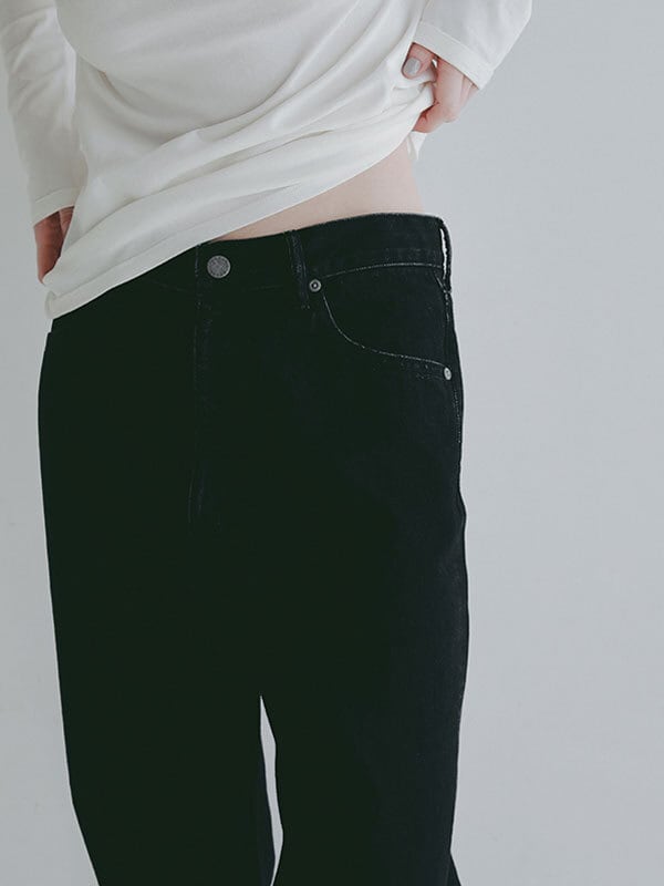 ほどよいヴィンテージ感をまとった、絶妙な加工が魅力のハイライズストレートデニム。綿100%のデニム生地を使用、ほど良い重さと自然な落ち感を兼ね備えた風合いが特徴。しっかりとした肉感がありながらも硬すぎず、穿き込むほどに身体に馴染んでいく素材感です。春らしい強めのブリーチカラーは奥行きのある色落ちを表現し、ブラックはシックで洗練された印象に仕上げる等、それぞれ異なる表情を楽しめるのも魅力。さりげなく存在感を放つオリジナルのタックボタンなど、細部にまでこだわりを詰め込んだ一本です。深めに設定したライズと長めの股下が、腰位置を高く見せながら縦のラインを強調し、すっきりとしたストレートシルエットを構築。ヒップから裾にかけてはほどよくゆとりを持たせることで、脚のラインを拾いすぎず、抜け感のあるバランスに仕上げています。トップスをタックインした際にもウエスト周りが美しく決まり、フロントやバックスタイルまで計算されたデザイン。ベーシックでありながらも、加工感やシルエットでさりげない個性を感じさせる一着です。フェミニンなフリルブラウスや軽やかなトップスと合わせたカジュアルなスタイルはもちろん、 コンパクトなカットソーやジャケットを合わせたクリーンな着こなしにも好相性。着こなし次第で幅広いスタイリングを楽しめるデニムパンツです。