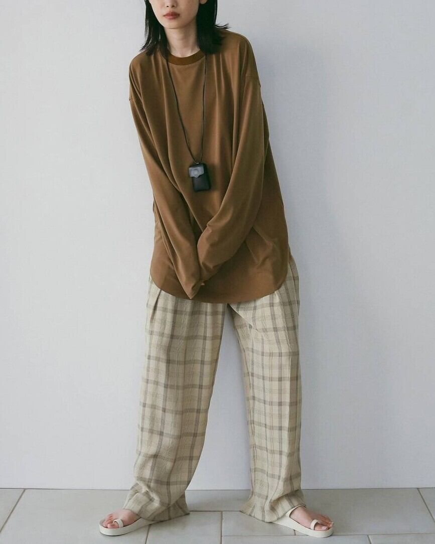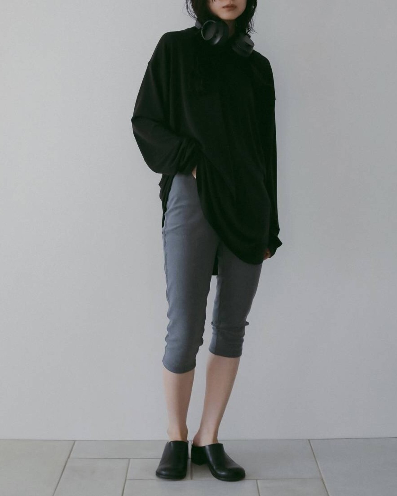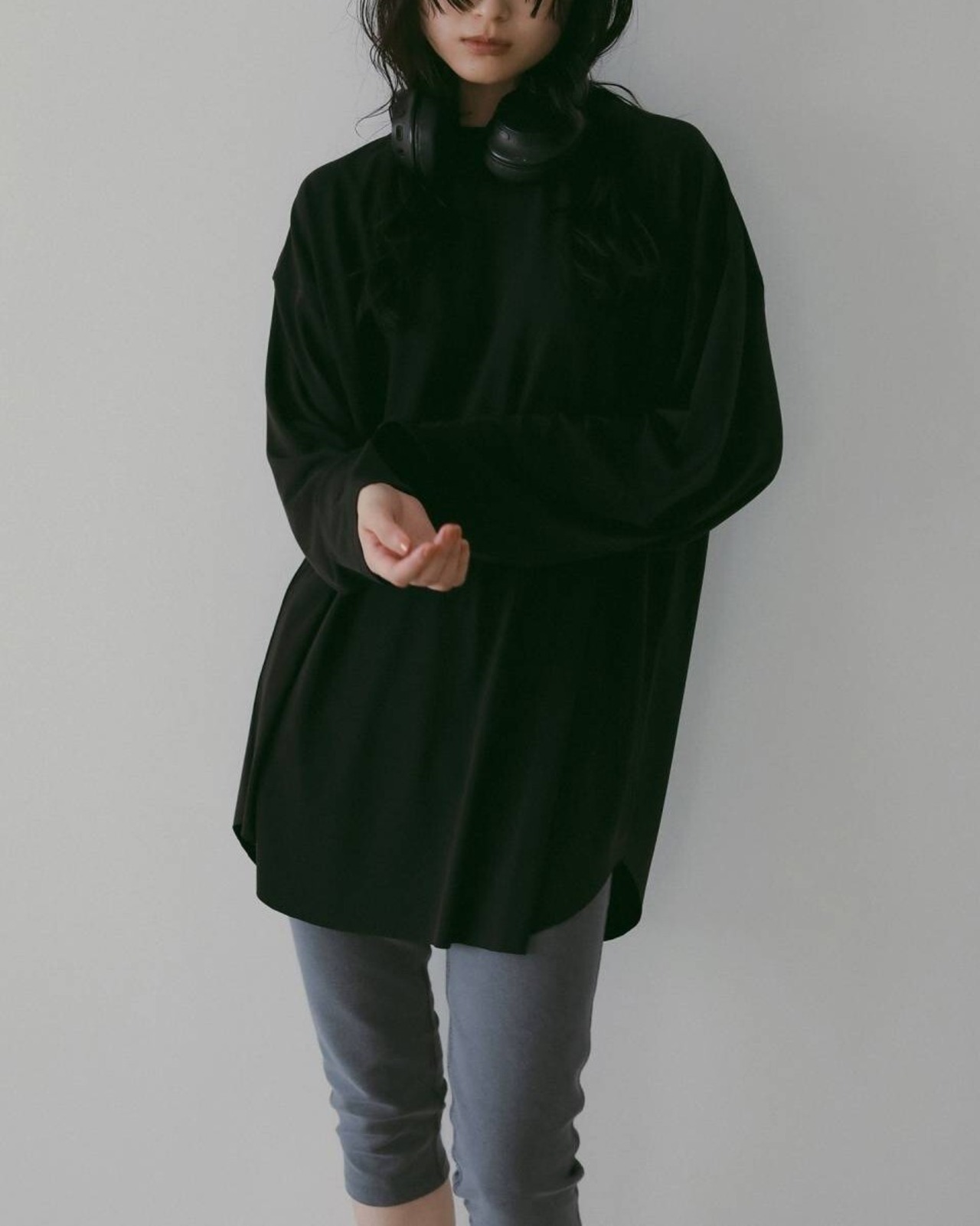 なめらかで程よくマットな質感のカットソー素材を使用したロングTシャツ。襟ぐりと袖口は同色の編み立てリブで仕上げ、シックな表情に。ゆったりとしたオーバーシルエットで、着るだけで自然な抜け感を演出します。ヒップが隠れる長めの丈感は、バイカーパンツなど細身のボトムとも好相性。ミニマルなデザインながら素材の表情が際立ち、一枚でもこなれたスタイリングが完成する一着です。