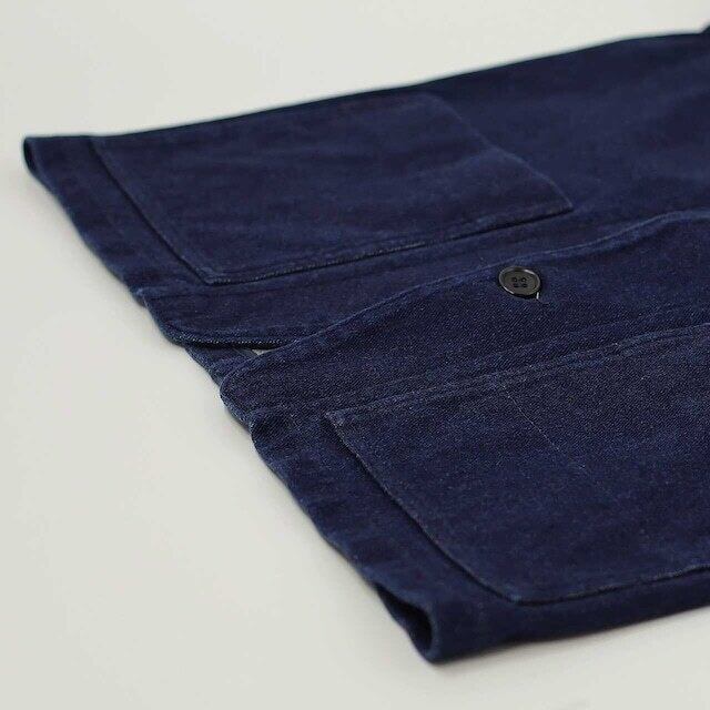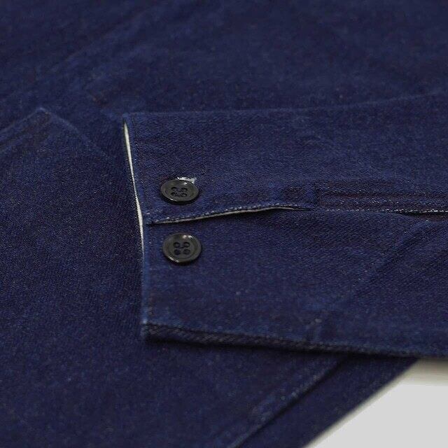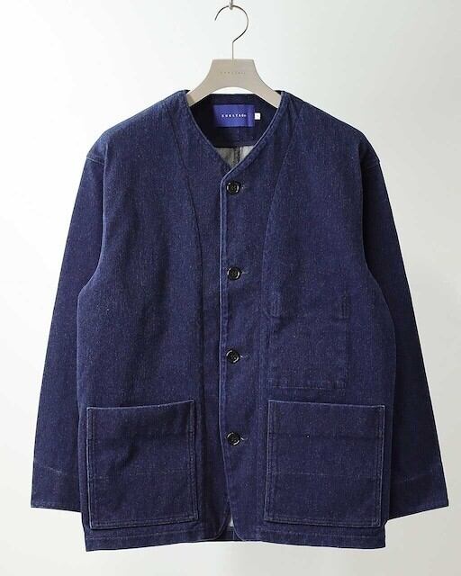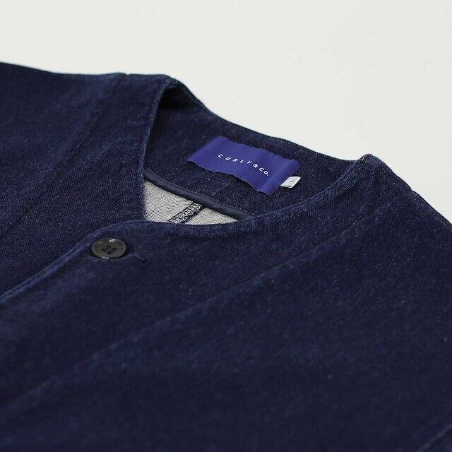 独自のストレッチインレイ素材を用いたノーカラーのカバーオール。糸の表面だけが染まり芯部分は白いまま残るロープ染色された糸を使用し、深みのある色に仕上げたニットデニム素材。ハイゲージで編み立てることで、ムラ感が強くハリのあるシャープな表情に仕上げており、indigoカラーに関しては着込んでいくことで自然に色落ちし、味わい深い表情に経年変化していきます。編み素材ならではの柔らかい肌当たりと伸縮性を持ち、優れた着心地を実現。丈感やサイズはオーセンティックなカバーオール型をベースにしていますが、ノーカラーデザインにしているので、カーディガン感覚で気軽に羽織れるアイテムに仕上がりました。