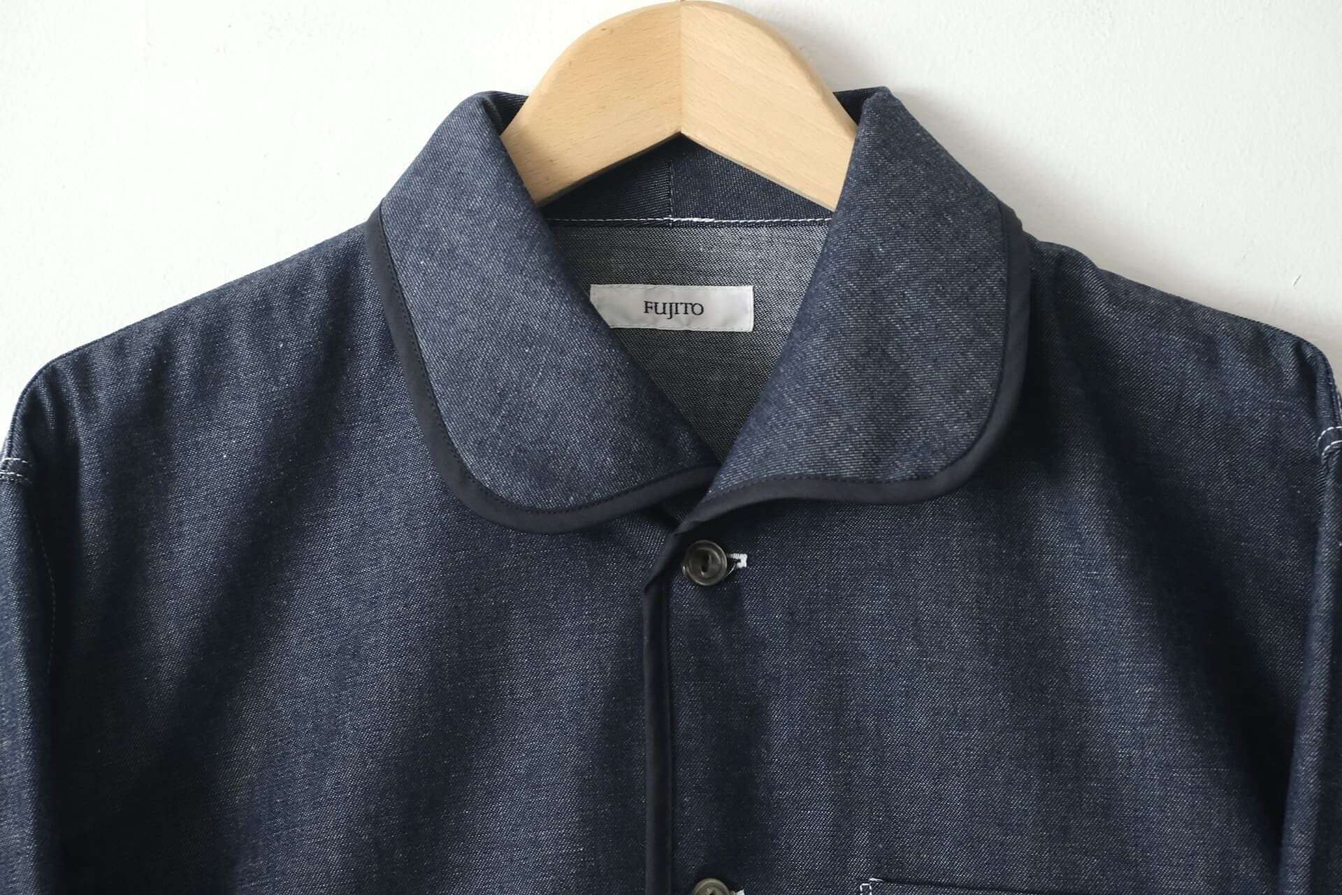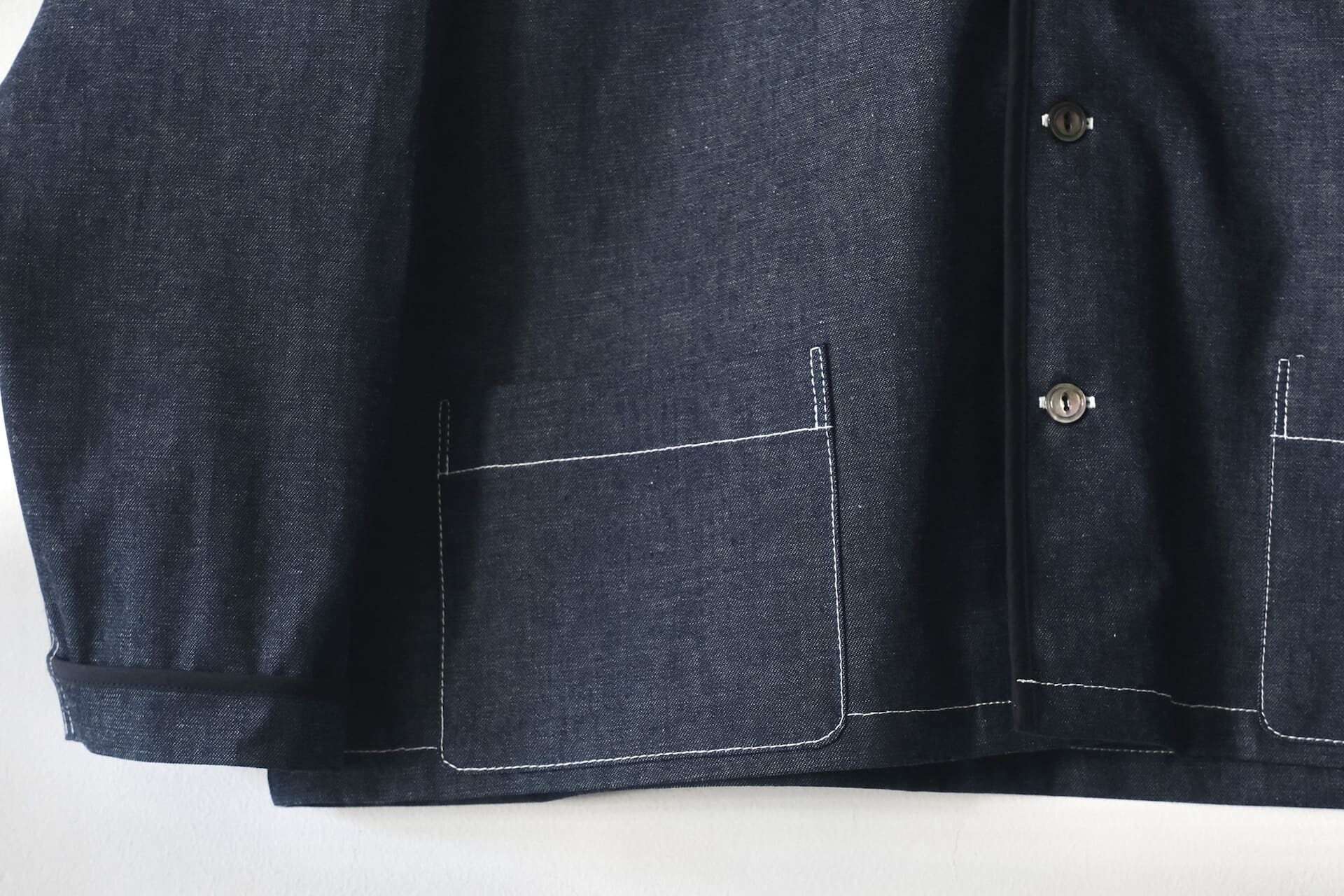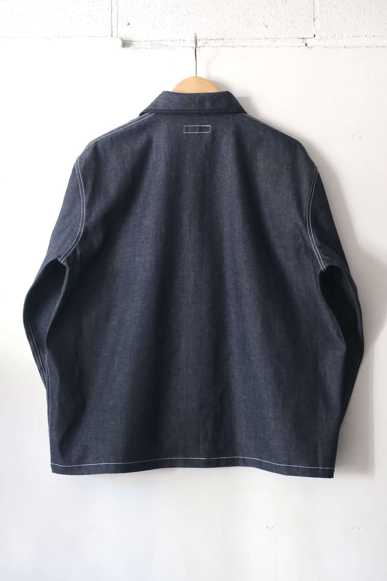 このシャツは、程よい厚みの8オンスのインディゴデニム生地を使っています。前立てや袖口などのパイピングやポケット、丸みがある衿の形が特徴的で、1枚で着ても存在感があります。シルエットは程よくゆったりとしたボックスシルエットで、Tシャツの上など羽織りとしても活躍してくれます。