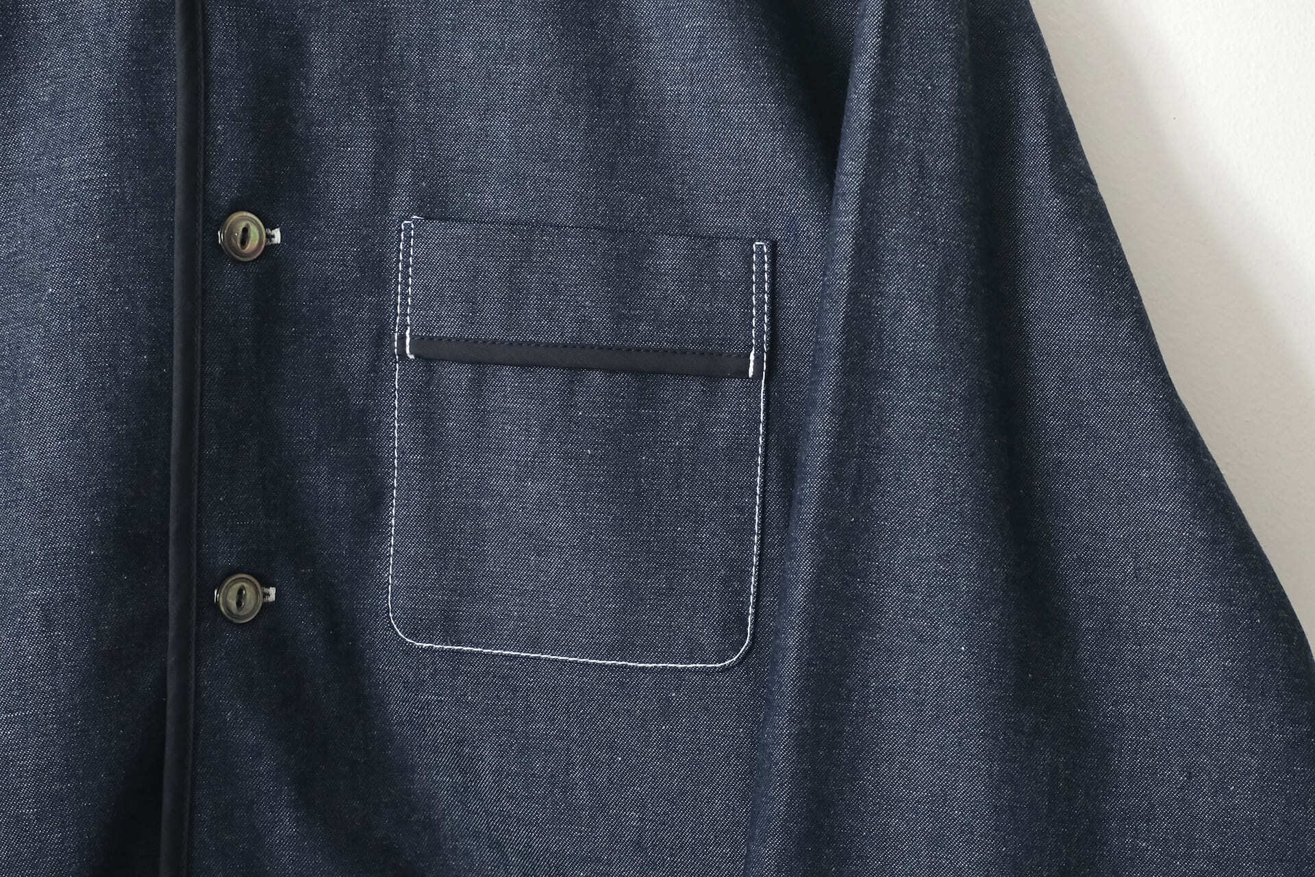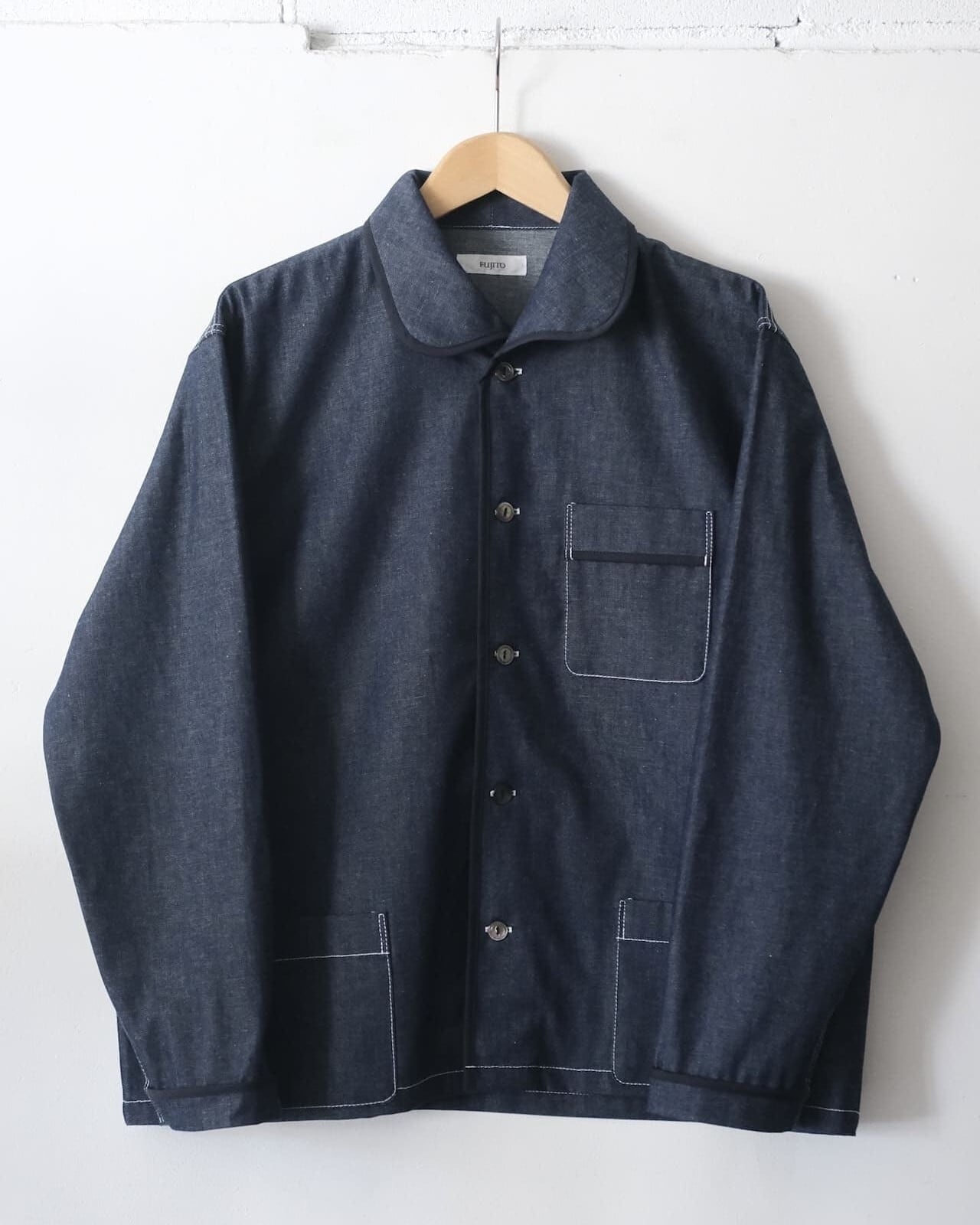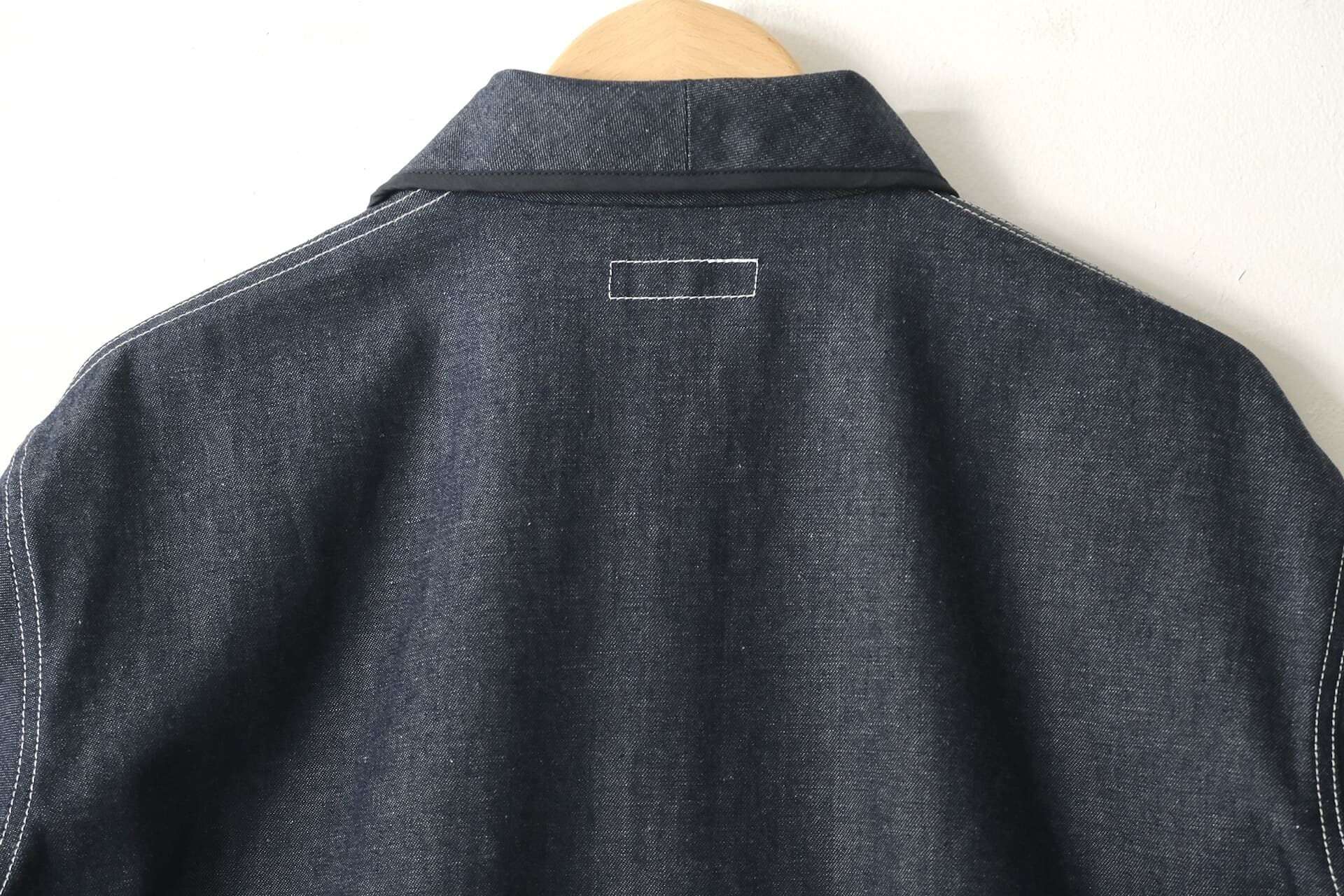 このシャツは、程よい厚みの8オンスのインディゴデニム生地を使っています。前立てや袖口などのパイピングやポケット、丸みがある衿の形が特徴的で、1枚で着ても存在感があります。シルエットは程よくゆったりとしたボックスシルエットで、Tシャツの上など羽織りとしても活躍してくれます。