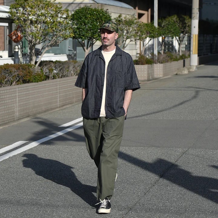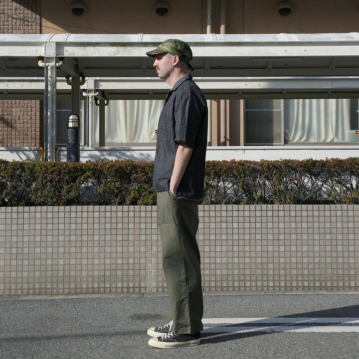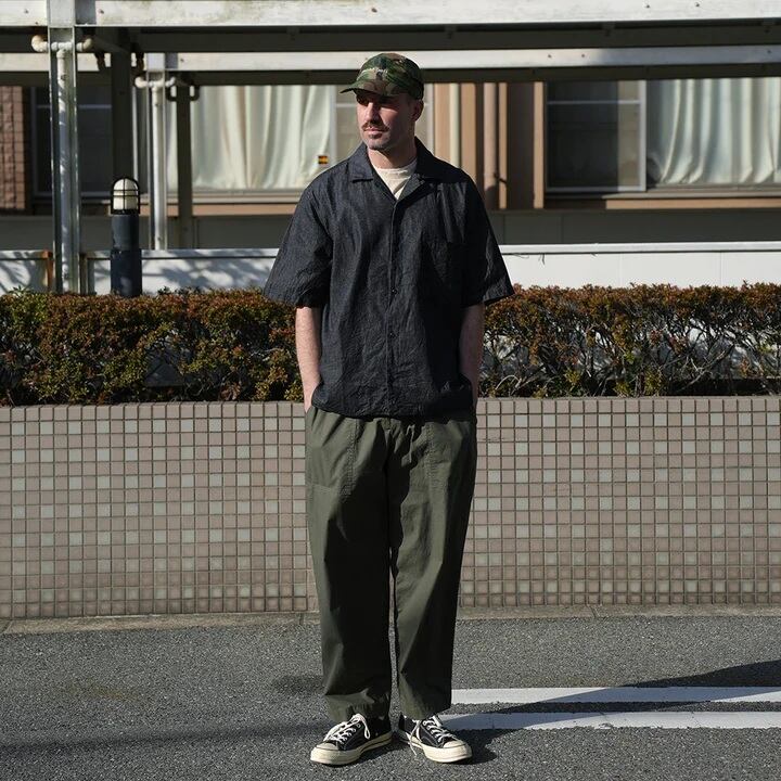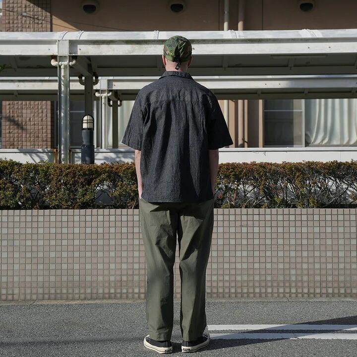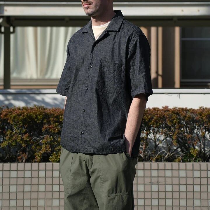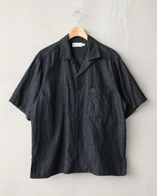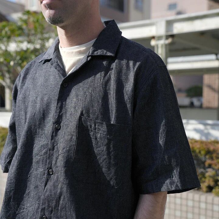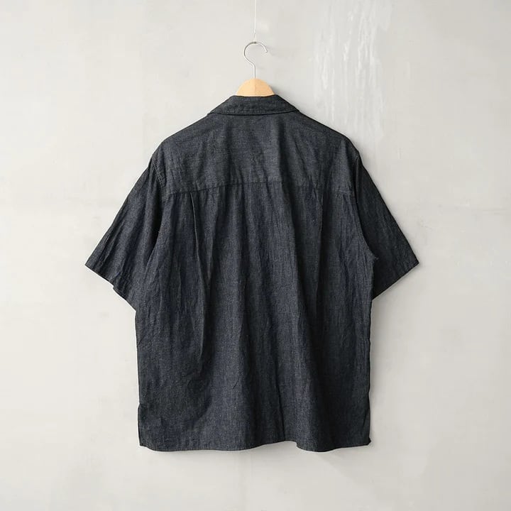 6ozの綿麻デニム素材を使用した半袖オープンカラーシャツ。肩幅・身幅にゆとりを持たせたスクエアシルエットで、リラックス感がありながらもバランスの良いデザイン。ボタンのかけ方次第で、きれいめな印象にも、色気のあるラフな羽織り方にも対応できる一枚です。素材には6ozの綿麻ムラ糸デニムを採用。生成りの麻の色味がデニムに深みを与え、独特の奥行きある風合いが特徴です。洗い込むほどに生地のコシが抜けて柔らかくなり、インディゴ特有のエイジングを存分に楽しめます。ナチュラルな経年変化を楽しみながら、長く愛用できるアイテムです。