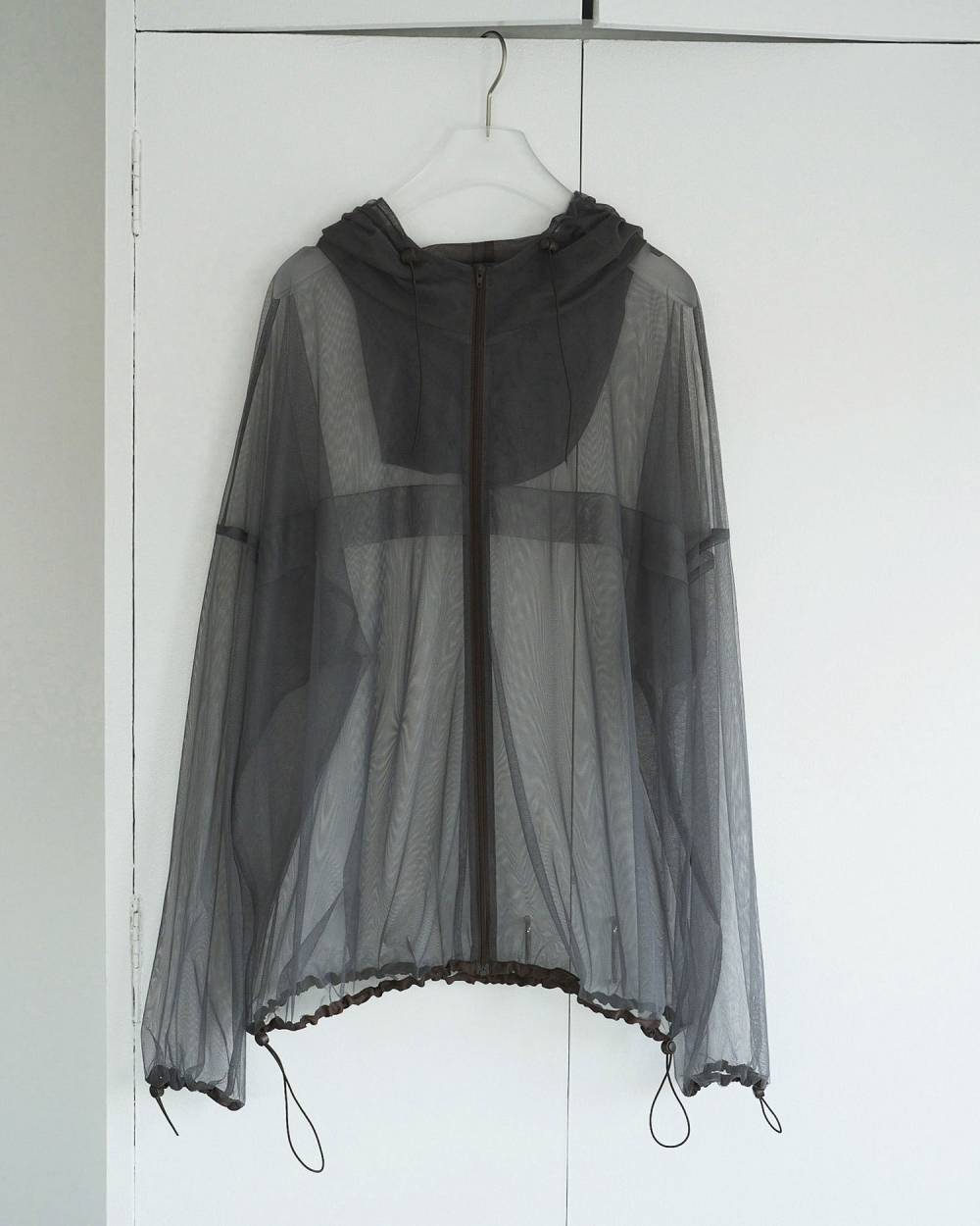 繊細なチュール素材を使用し、オーバーサイズで仕上げたZIPブルゾン。配色にした袖口や裾の別布パイピングデザインや、付属使いもポイント。フードの内側は、付属の色と合わせて、配色のチュールを使用することで、2色が優しく混ざりニュアンスある仕上がりになっているのもこだわり。シンプルなジャケットのインナーとしてレイヤードするだけで、一気にスタイリングが映える一着。トップス感覚でプルオーバーとして着たり、Tシャツやラフなタンクを敢えて透かして見せるのもおすすめです。
