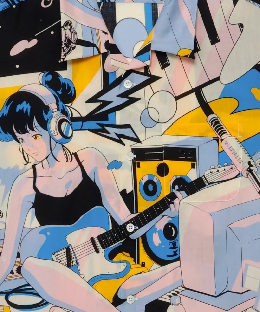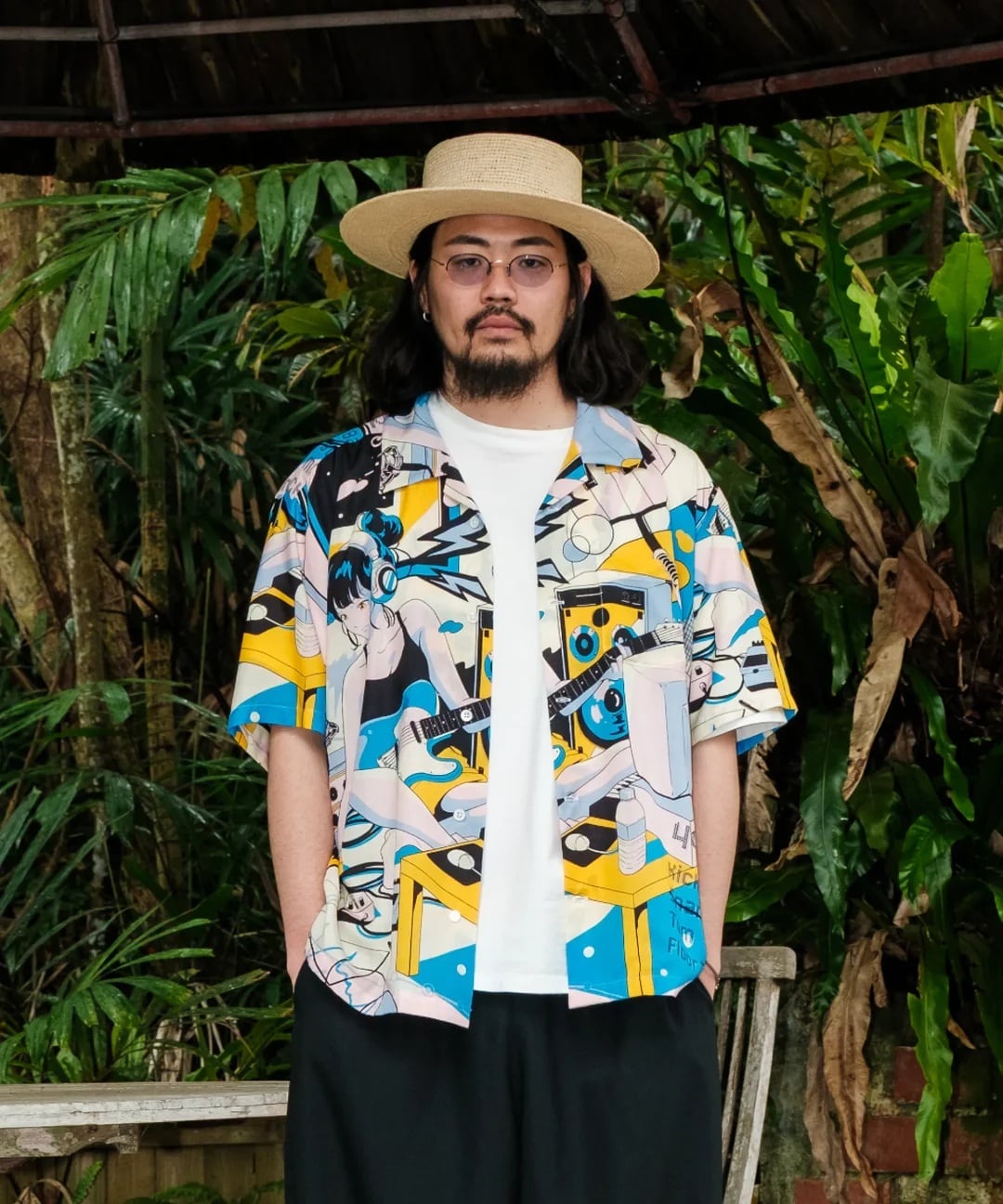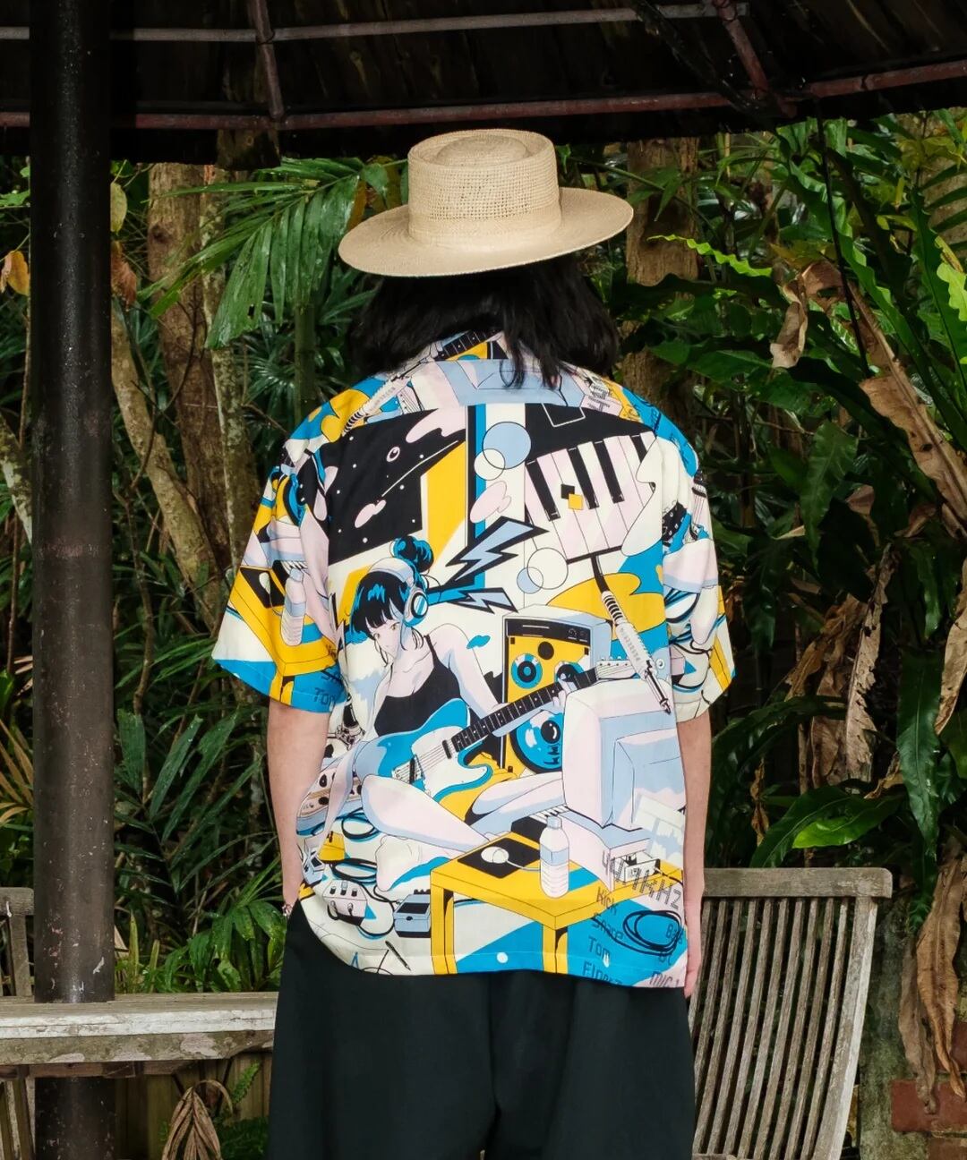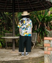 『南国リゾート倶楽部』『東京干物語』に続く、「物語シリーズ」最終章。自室で音楽制作に勤しむ主人公を、90年代シティポップ風のレトロなタッチで描いたアロハシャツ。アートワークはお馴染みイラストレーターのChao!氏が担当。ヘッドフォンを装着して自分だけの世界に深く潜る様子を、躍動感ある色彩と緻密な描き込みで表現。刺激と休息を経て辿り着いた「没頭」という幸福。ノイズを遮断して自分の好きなことに夢中になりたいあなたへ。