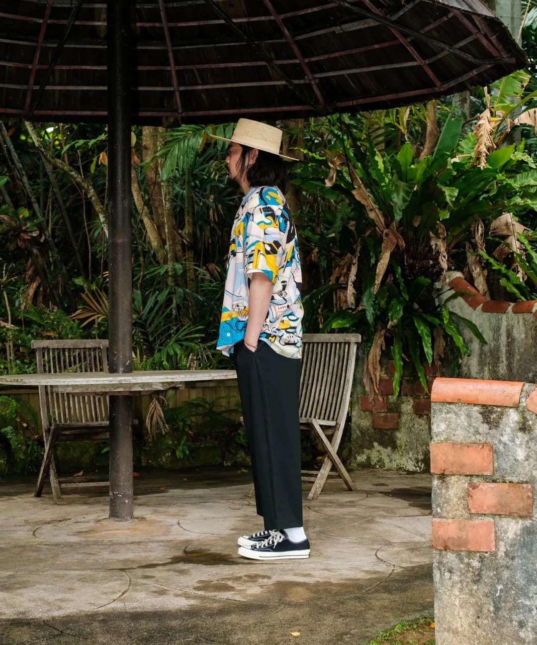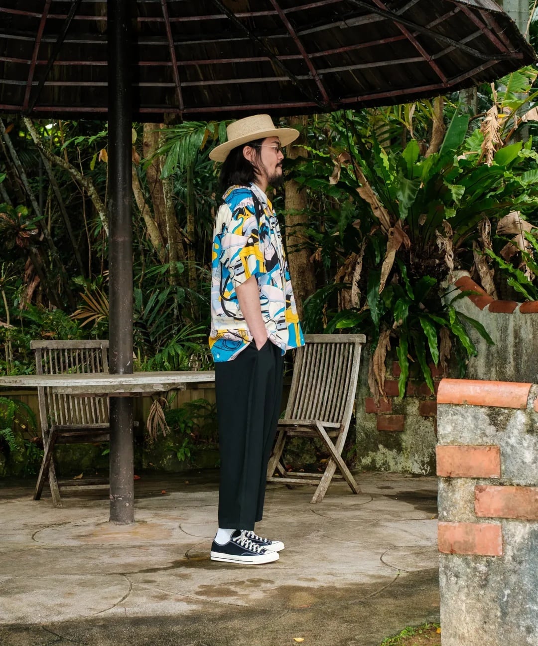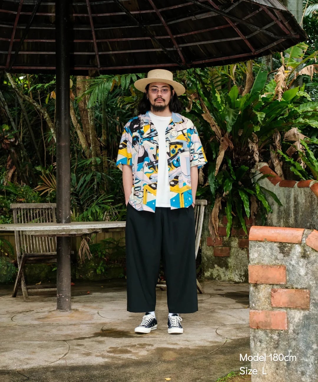 『南国リゾート倶楽部』『東京干物語』に続く、「物語シリーズ」最終章。自室で音楽制作に勤しむ主人公を、90年代シティポップ風のレトロなタッチで描いたアロハシャツ。アートワークはお馴染みイラストレーターのChao!氏が担当。ヘッドフォンを装着して自分だけの世界に深く潜る様子を、躍動感ある色彩と緻密な描き込みで表現。刺激と休息を経て辿り着いた「没頭」という幸福。ノイズを遮断して自分の好きなことに夢中になりたいあなたへ。