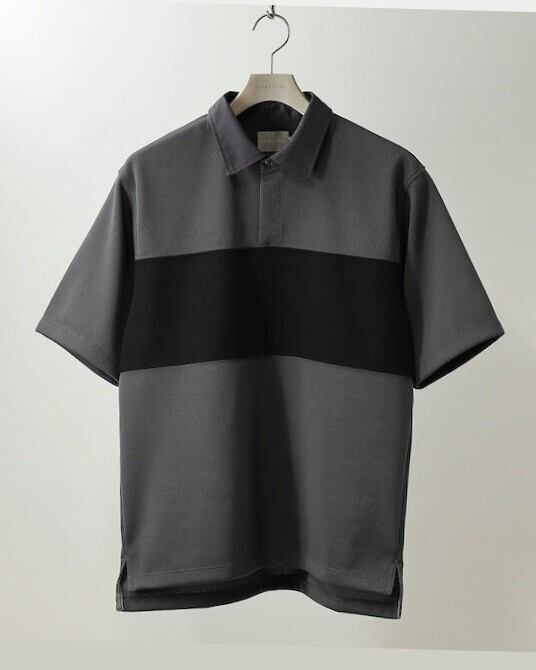 リサイクルポリエステルで編み立てたダブルフェイス素材を用いたラガーシャツ。回収した原料をケミカルリサイクルによって一度引き揃えの三子糸にした後に仮撚りという工程を経て、表面の風合いに変化を出しています。いわゆるラガーシャツと呼ばれるアイテムをニットソーブランドらしく再解釈。襟にはカツラギの代わりに34番手のT/Cツイルを使用し、張り感がありながらもシャープに、そして前開きのボタン部分も隠す事でスッキリとした印象に仕上げています。身頃は適度なゆとりをとり袖丈も若干長めに設定したリラックス感のあるシルエット。カジュアルでスポーティなアイテムを、モダンでエレガントなタウンウェアに仕上げました。