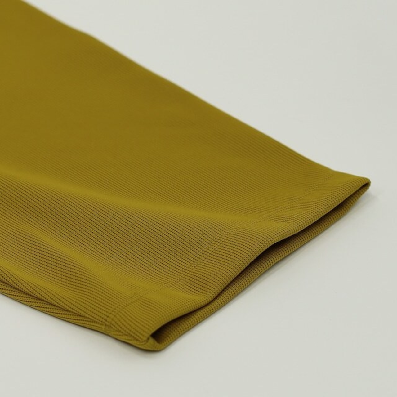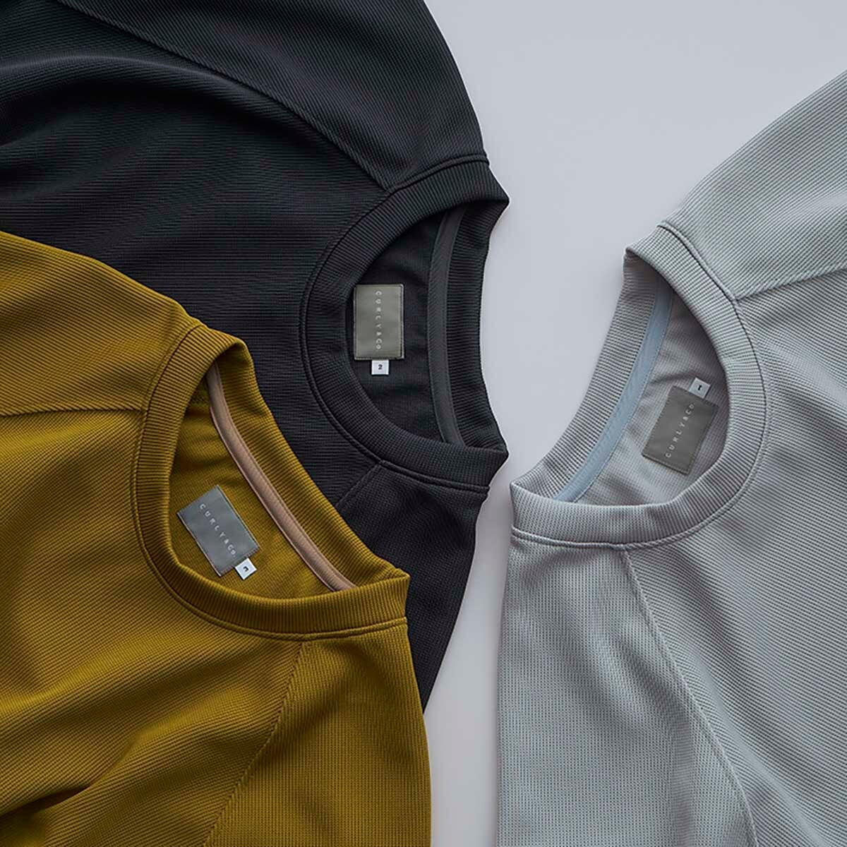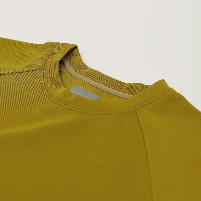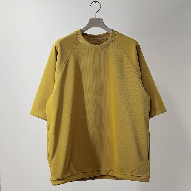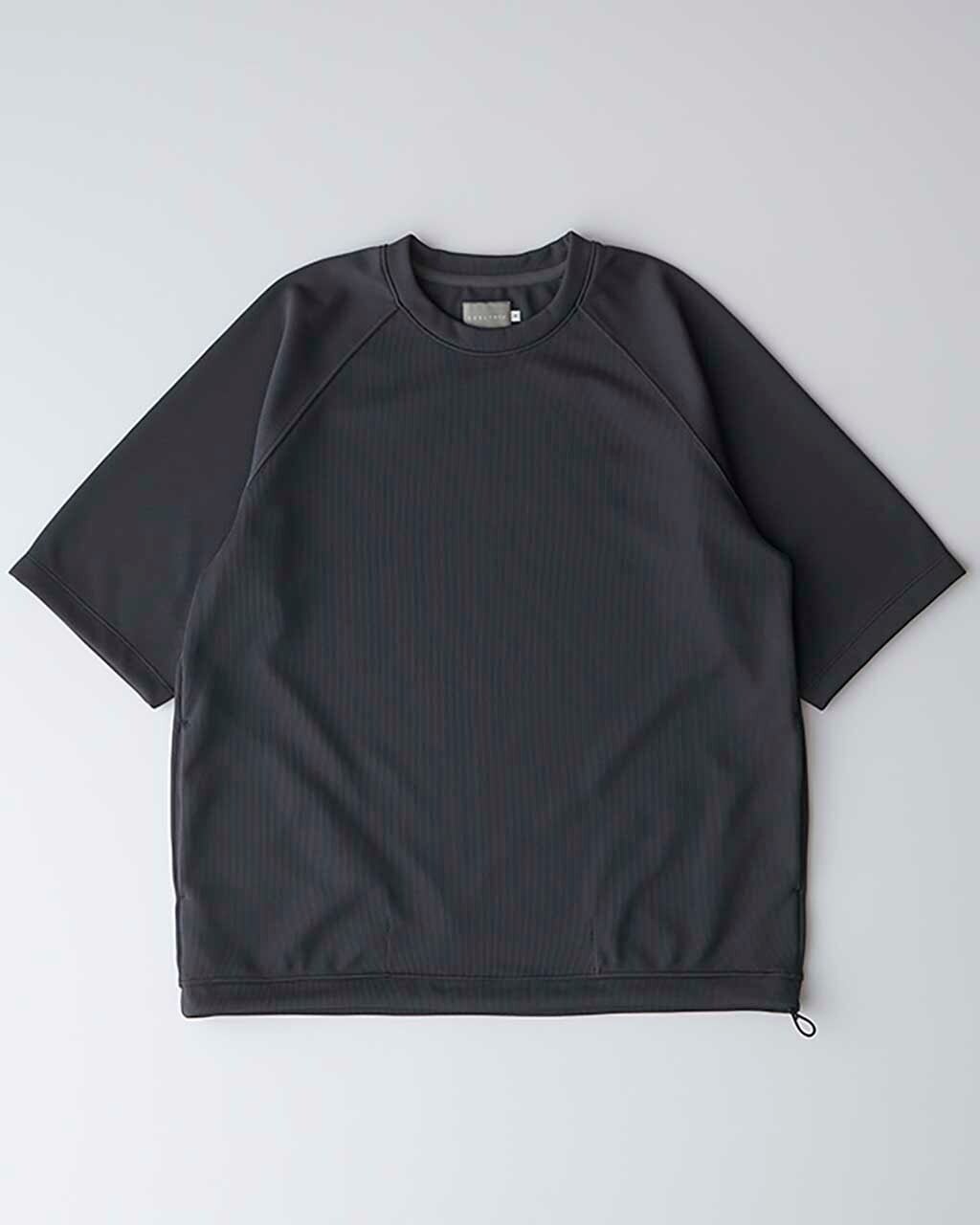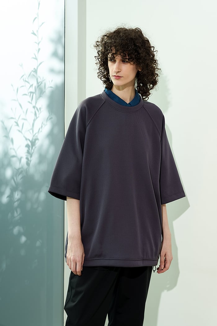 リサイクルポリエステルで編み立てたダブルフェイス素材を用いたクルーネックTシャツ。回収した原料をケミカルリサイクルによって一度引き揃えの三子糸にした後に仮撚りという工程を経て、表面の風合いに変化を出しています。ラグランスリーブの袖丈を少し長めに設定し、身幅にも適度なゆとりを持たせたリラックスシルエット。裾のドローコードを絞って丸みを出すこともできます。厚すぎず薄過ぎずの生地なので長いシーズン着用可能。シームポケット有り。