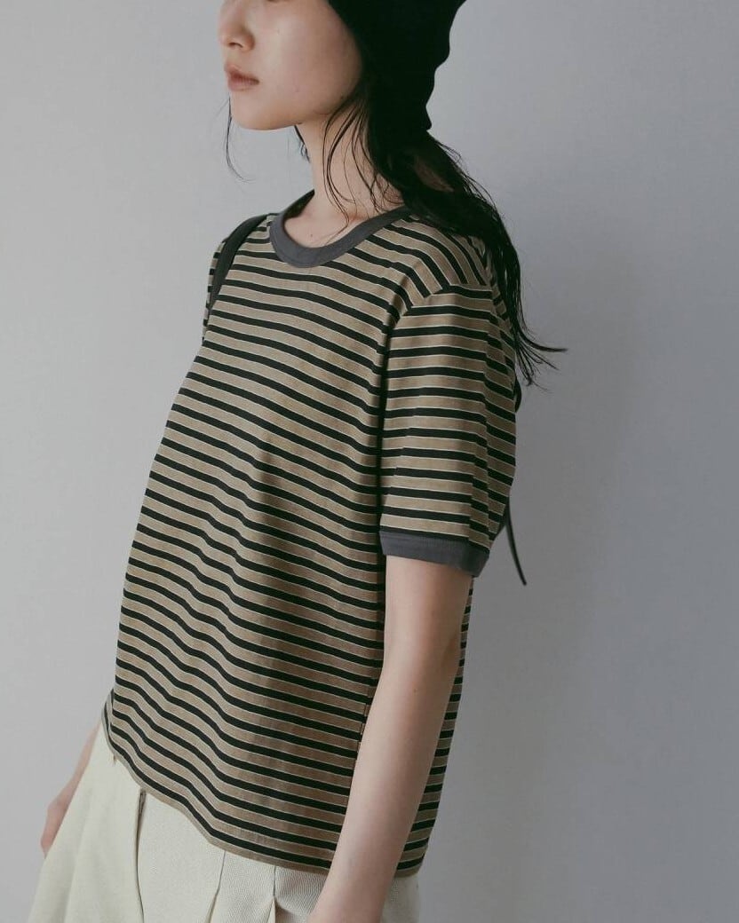 薄手のコットン素材を使用したボーダーTシャツ。程よくコンパクトなシルエットで、すっきりと着られる一枚です。ムラ感のあるプリントボーダーが、ヴィンテージライクな表情を演出。落ち着いた配色で、シックにまとまります。一枚ではもちろん、ジャケットのインナーとしても映えるアイテムです。