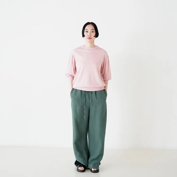 柔らかなレーヨン麻ポプリン生地を使用。さらりとした肌触りで通気性が良く、春夏に最適です。ご家庭でハンドウォッシュ可能なので、お手入れも簡単で心地よく着用いただけます。