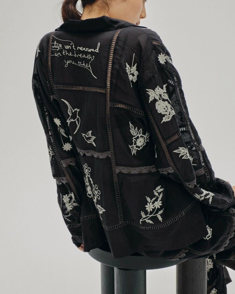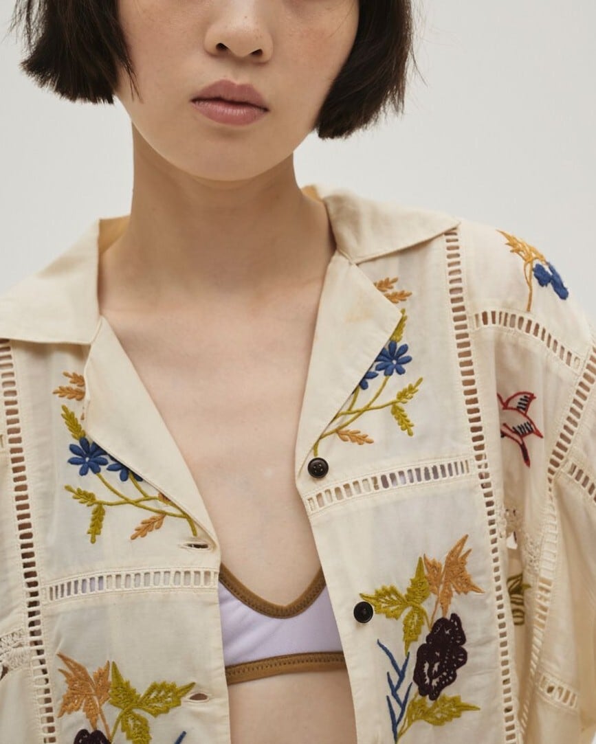 13種類もの刺繍をふんだんにあしらったパッチワークが目を惹く開襟シャツ。インドで一枚一枚に刺繍をあしらい、柄の配色や袖口のディテール等細部にまでこだわりの詰まったアイテム。シンプルなボトムスに合わせるだけでこなれた印象に。新色にバーガンディを追加しました。