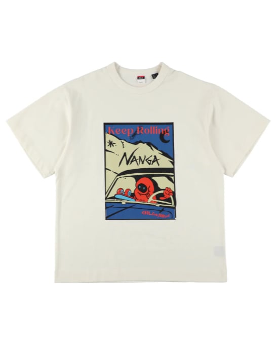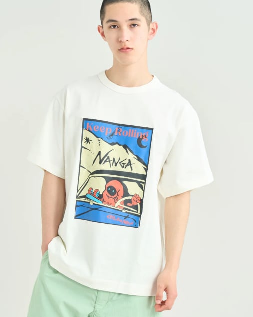エコハイブリッドシリーズをベースに、遊び心のあるグラフィックをのせた一枚。スケートボードを小脇に抱え、クルマを走らせる寝袋モチーフのキャラクター。“Keep Rolling”のメッセージとともに、軽やかなムードを添えてくれます。素材には、リサイクルコットン「Ferre Yarn(フェレーヤーン)」を使用。環境に配慮しながらも、やわらかく肌なじみの良い風合いで、気負わず着られる快適な着心地に仕上げています。程よい厚みのある生地で透けにくく、一枚でも着用しやすいバランス。ラフに着てもサマになり、デイリーに取り入れやすいのも魅力です。アウトドアからタウンユースまで、シーンを選ばず活躍。肩の力を抜いて着られる、ナンガのスタンダードな一着です。