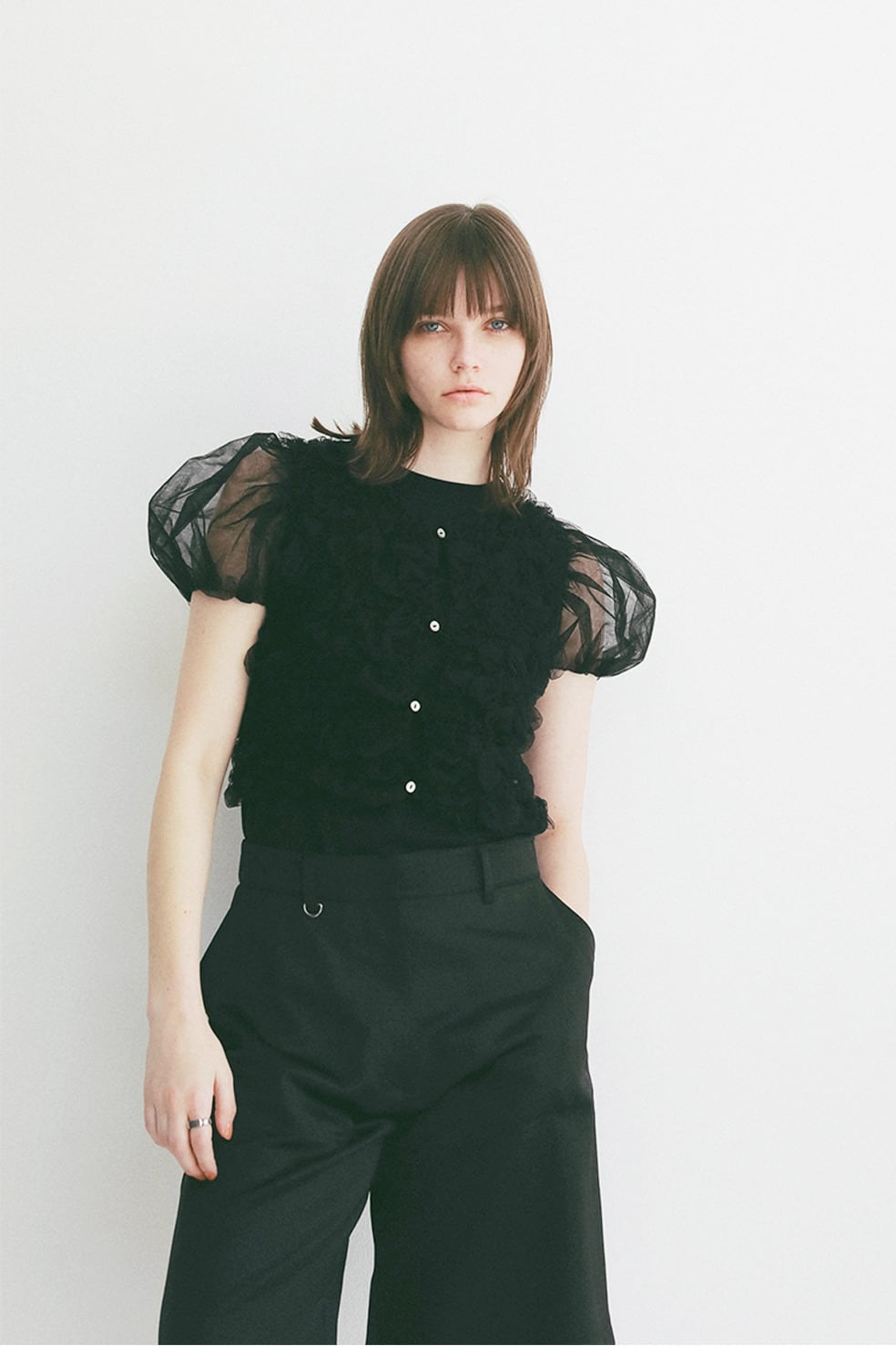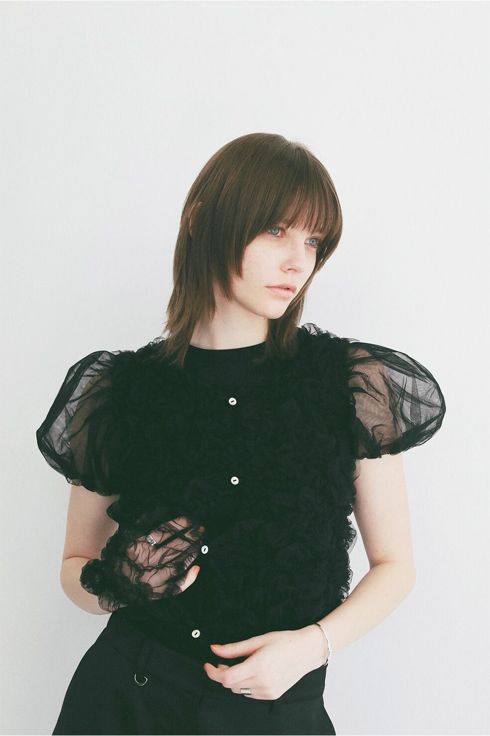 人気のTULLE VEST LAYERED TOPSに新色のSAXが加わり登場。柔らかなチュールにランダムなシャーリング刺繍を施したショートベストと、チュールのパフスリーブがドッキングされたTシャツのレイヤードアイテム。透け感と立体感を演出し、カジュアルさと上品さのバランスの取れたデザインに仕上げました。シンプルなトップスとしても、ジャケットやカーディガンとの重ね着でも着こなせる万能アイテム。それぞれ単品でも使いやすく、スタイリングの幅が広がります。ベストは釦開きで、前後どちらでも着用可能なWフェイス仕様です。