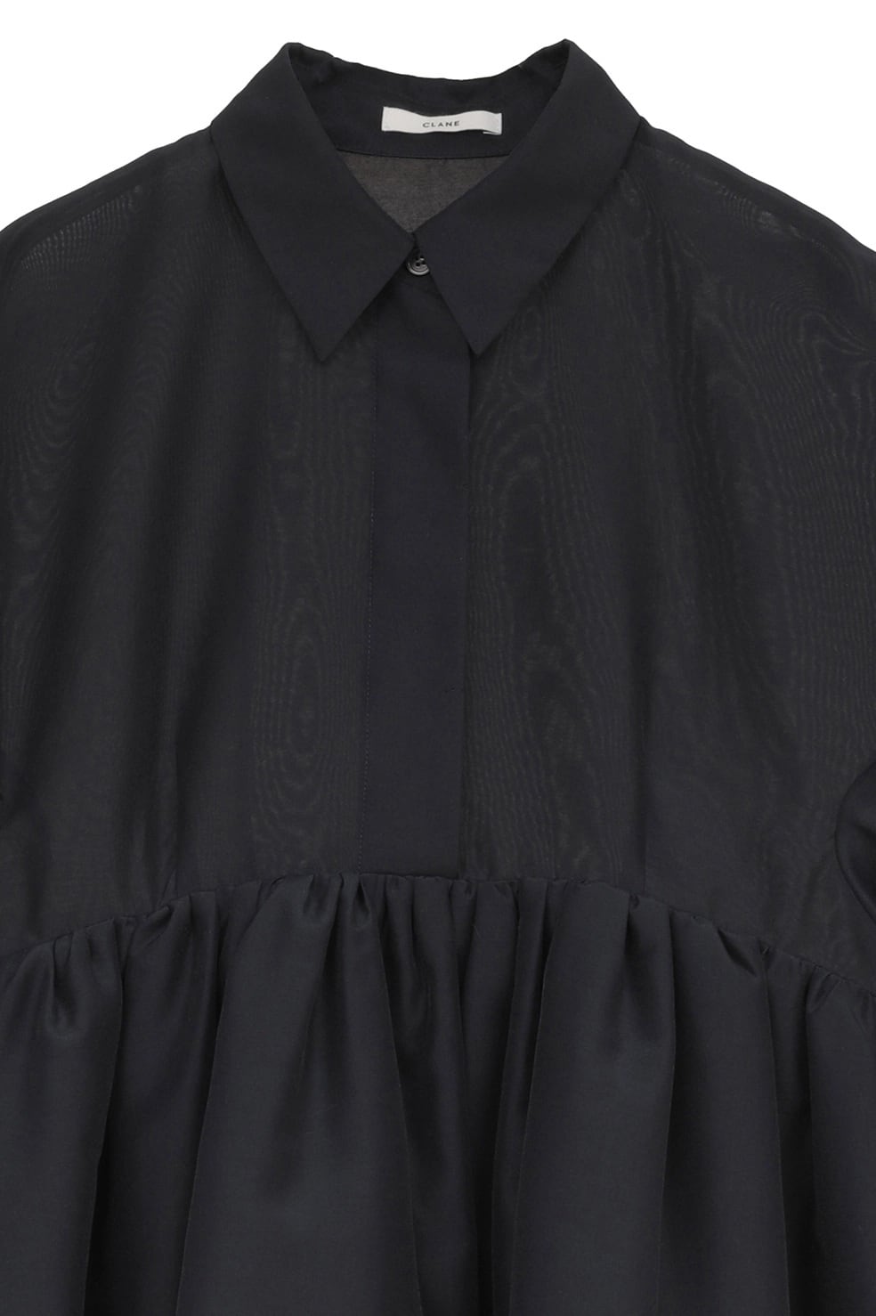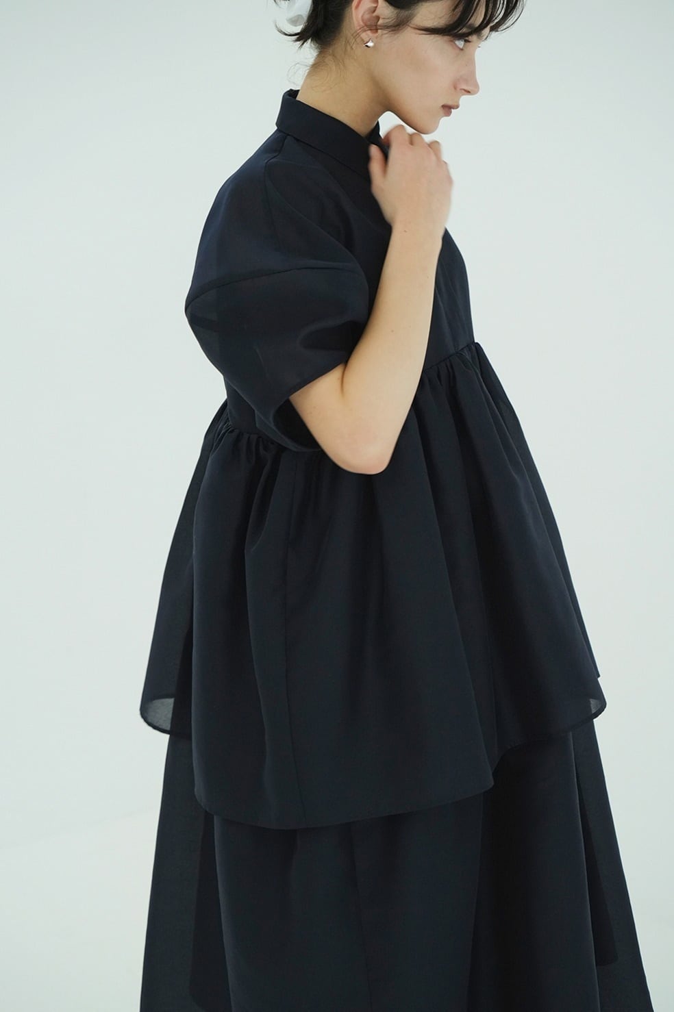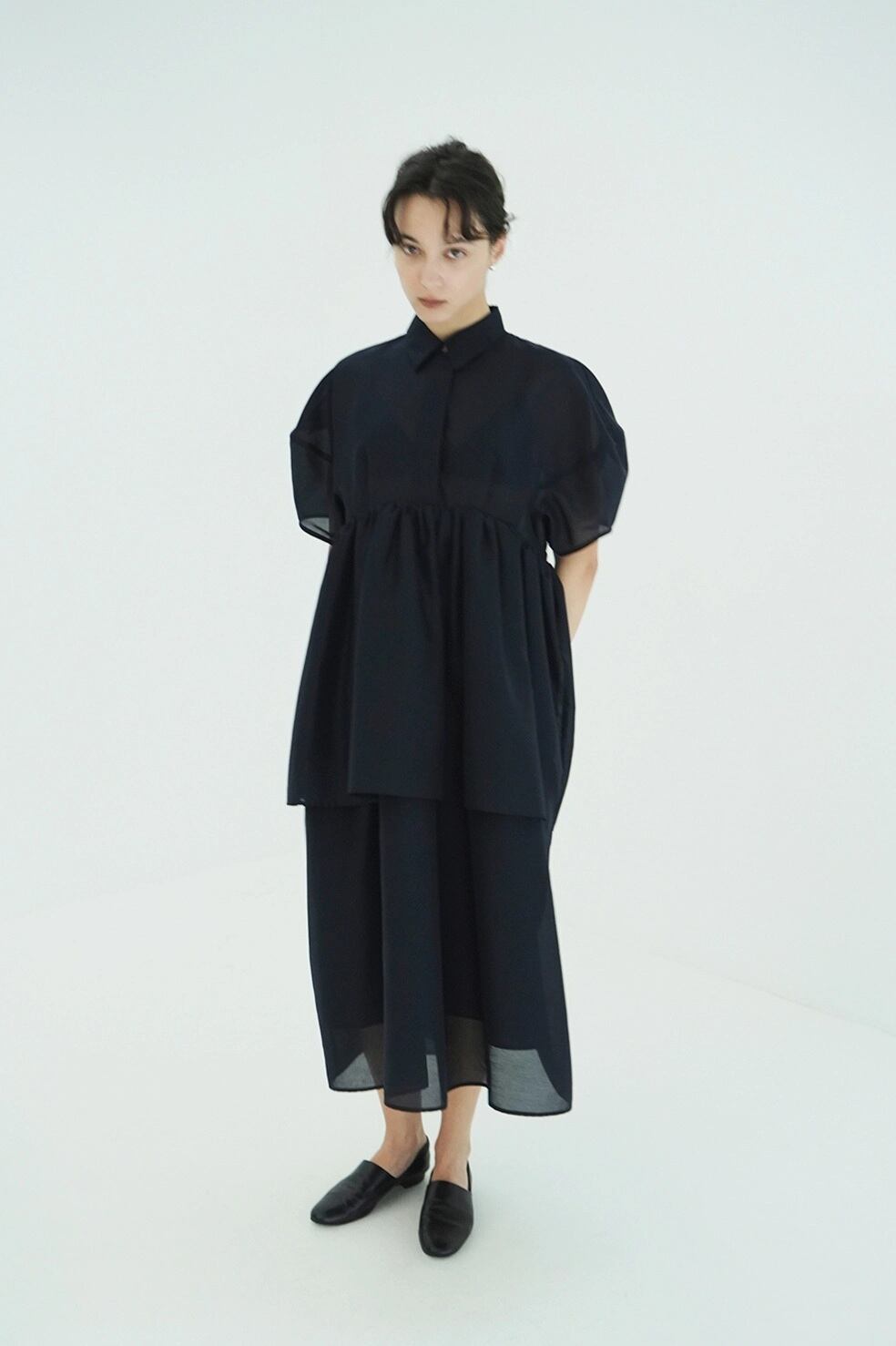 ハリ感と適度な透け感のある、上品なオーガンジー素材が女性らしさを引き立てるワンピース。控えめな光沢で、モードながら上品な印象を演出します。スカート部分はティアードになっており、動く度にふんわりと広がる美しいシルエットがポイント。丸みのあるフォルムスリーブがCLANEらしく、二の腕もすっきりとカバーしてくれます。一枚で主役になるデザインながら、軽やかな透けで抜け感も演出。シンプルな中にモードなエッセンスを感じさせるシルエットで、大人の女性らしい洗練されたスタイルを叶えます。