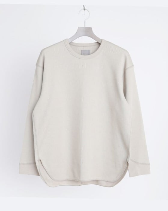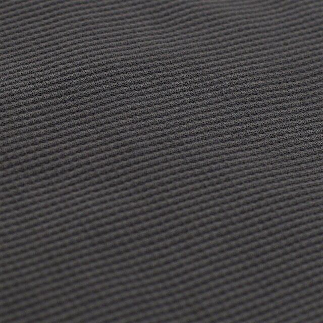 本来カジュアルなワッフル地の表糸に、ポリエステルの光沢感のある糸を使用することで、上品な印象をプラスしました。カジュアルさと上品さが絶妙にミックスしたワッフル地です。また、綿100%のワッフルよりも、軽い着心地です。